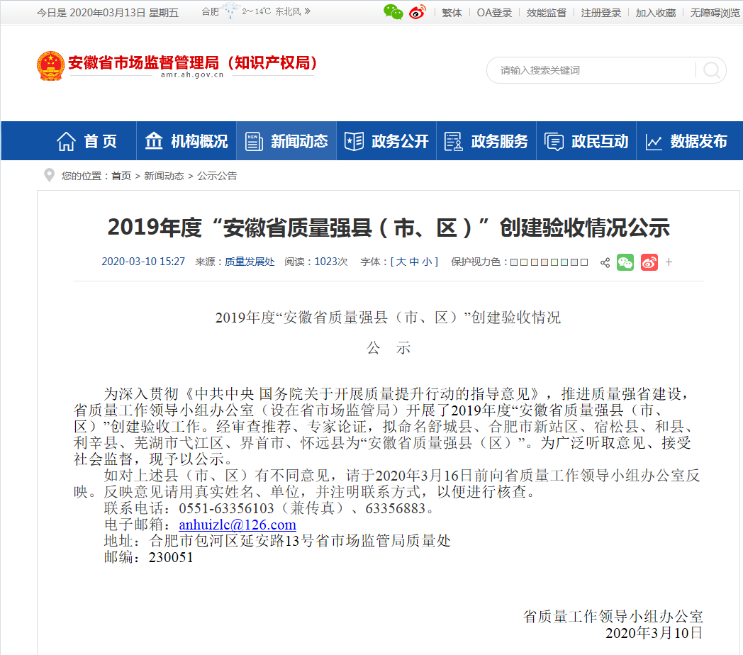 2019年度“安徽省质量强县(市、区)”创建验收情况公示